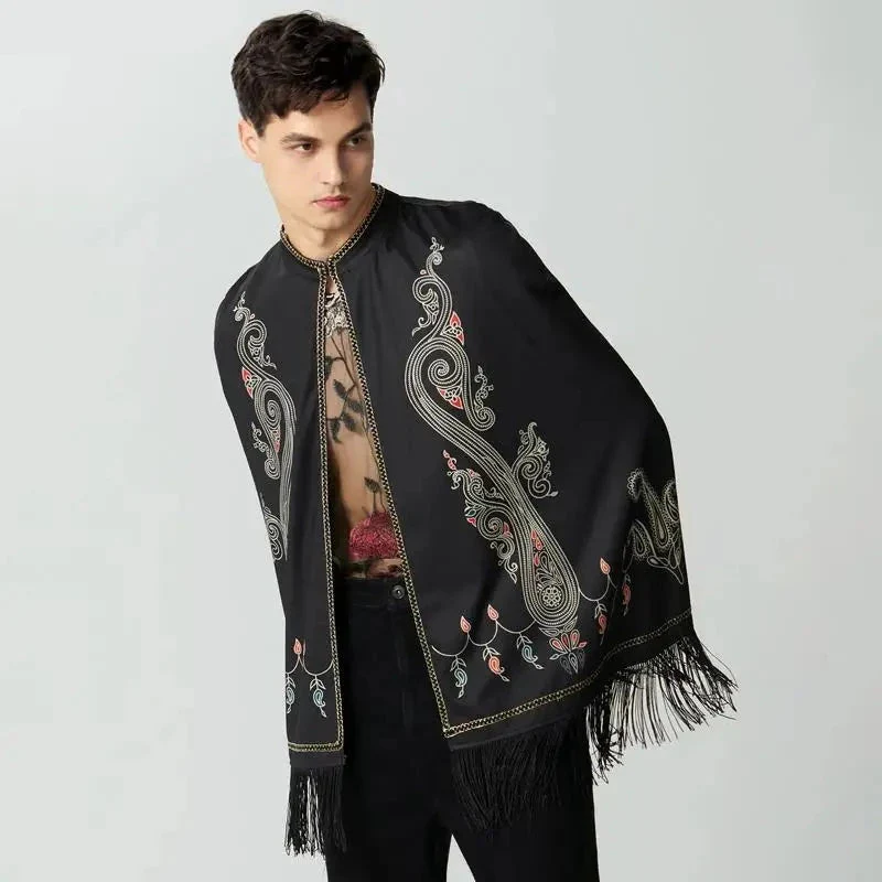 Explorez le chic moderne avec notre cape noire pour homme, ouverte à l’avant, ornée de franges et de motifs floraux originaux. Cette pièce unique allie élégance et originalité, parfaite pour affirmer votre style. Disponible maintenant, cette cape apporte une touche distinctive à votre garde-robe. Optez pour l’audace et l’élégance avec cette création exceptionnelle.