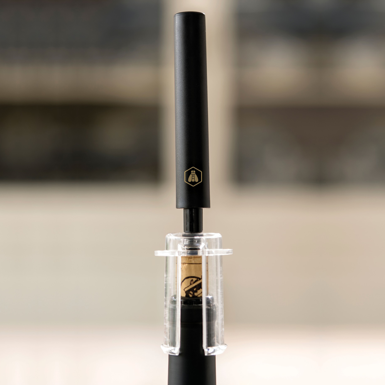 Le set est composé d’un tire- bouchon à pression d’air, un bec verseur aérateur, un bouchon stoppeur et d’un coupe-capsule.