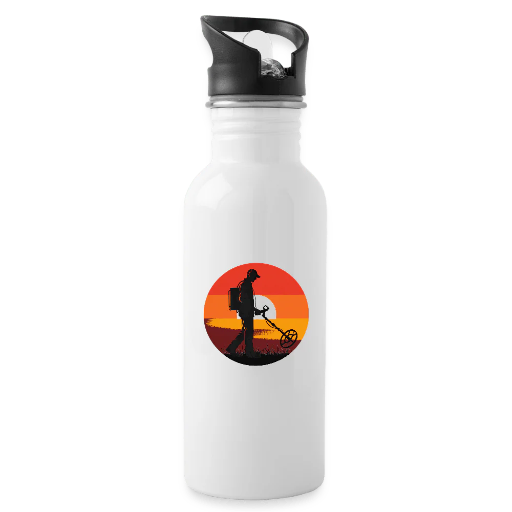 Ce design montre un détectoriste au coucher de soleil.