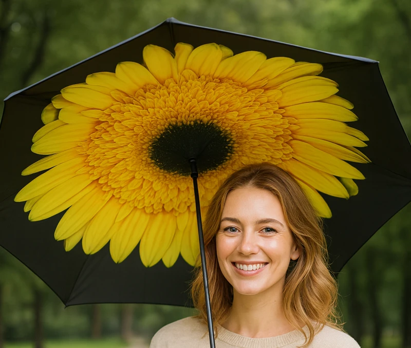 Ce parapluie inversé à fleur de tournesol dispose d’une toile en pongé, reconnue pour sa résistance. Son diamètre de 107 cm offre une couverture généreuse contre la pluie. Avec ses 81 cm de longueur de mât, ce parapluie anti-UV est pratique à transporter. Son poids de 500 grammes est un gage de solidité et de confort d’utilisation.