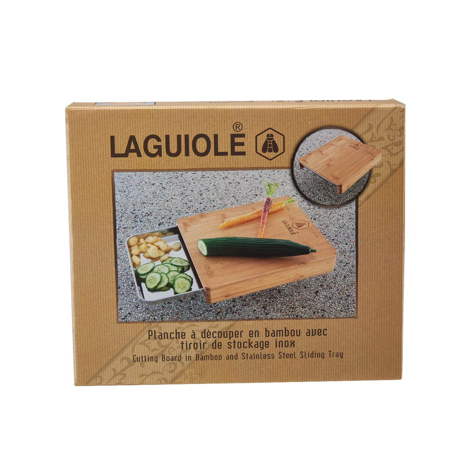 La planche en bois est associée à un tiroir de rangement en inox qui permet de retenir les miettes lors de la découpe du pain ou du stockage des aliments découpés.