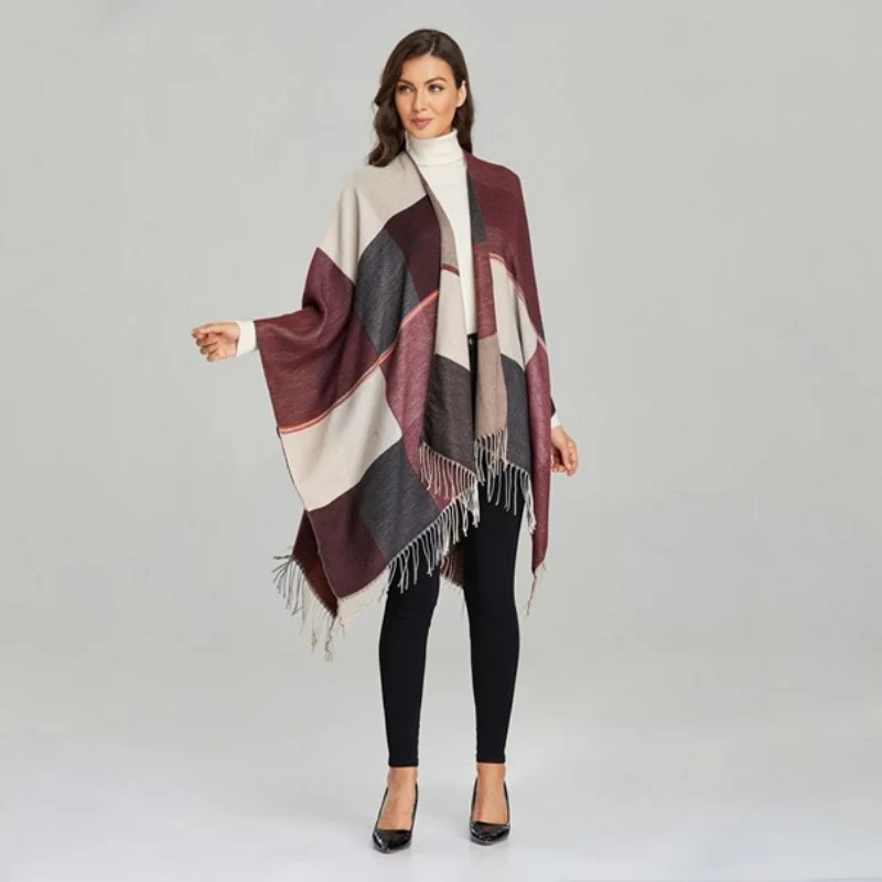 Craquez pour cet élégant poncho à carreaux bordeaux et gris pour femme ! Son design moderne avec ses franges vous donnera immédiatement un style chic et féminin. Vous pouvez le porter avec un jean pour un style décontracté ou un pantalon noir et des talons hauts pour un look plus élégant. Ce poncho tendance et agréable à porter convient à toutes les morphologies. Portez-le avec assurance en toute occasion, que ce soit pour aller au boulot ou retrouver vos amis pour un verre.