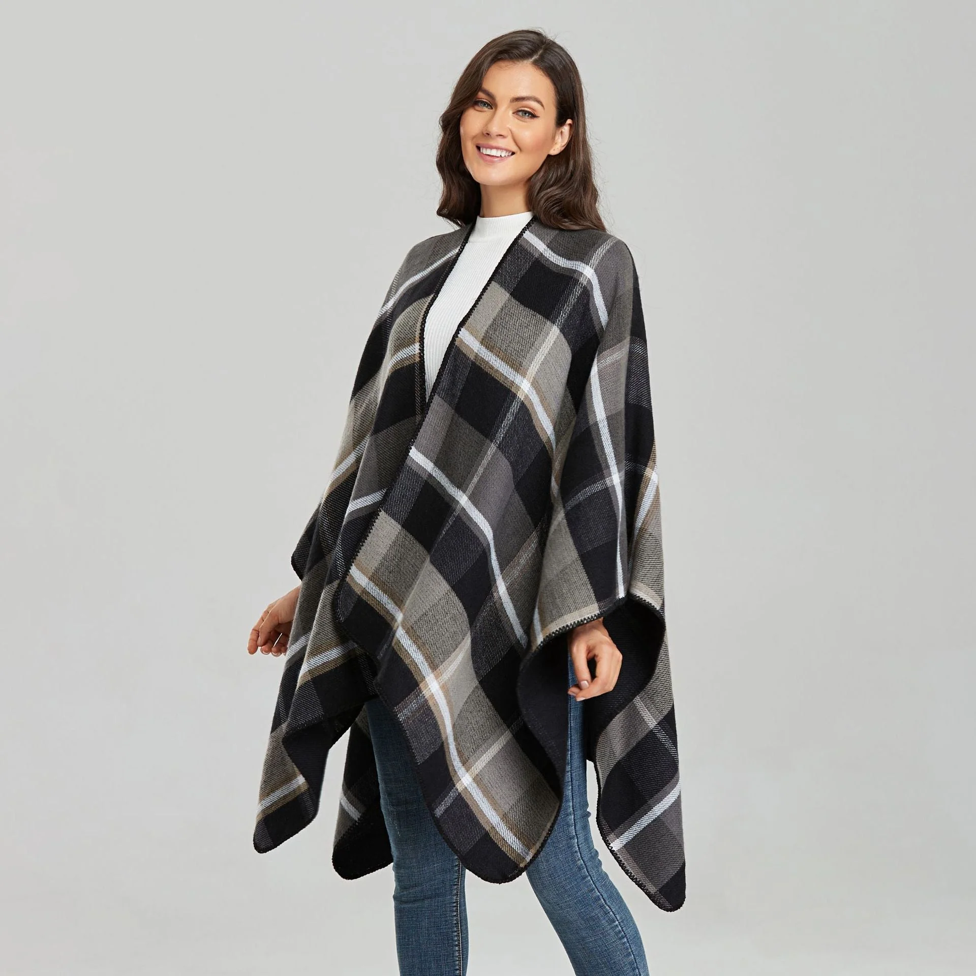 Poncho pour femme à carreaux gris et noir