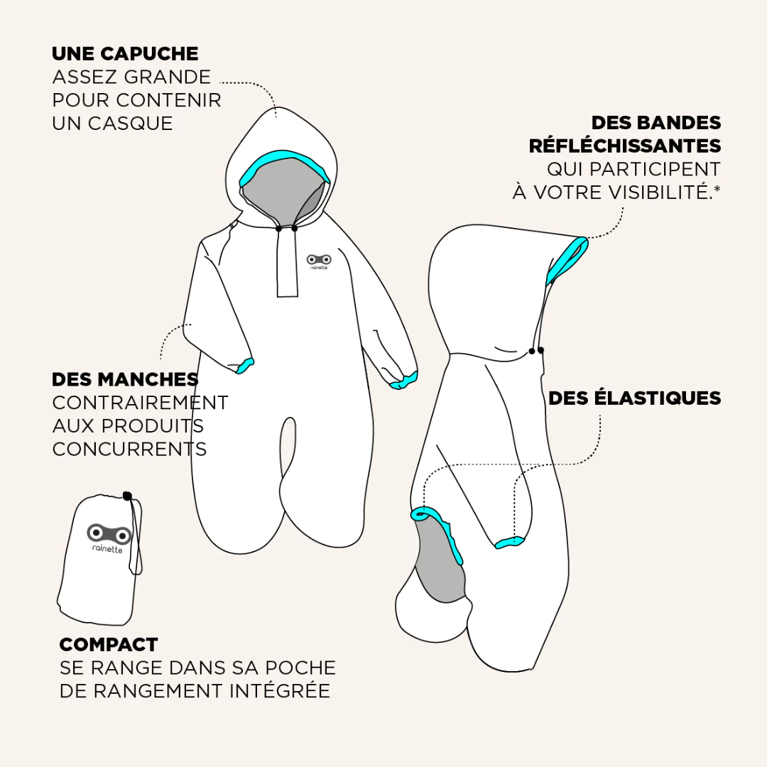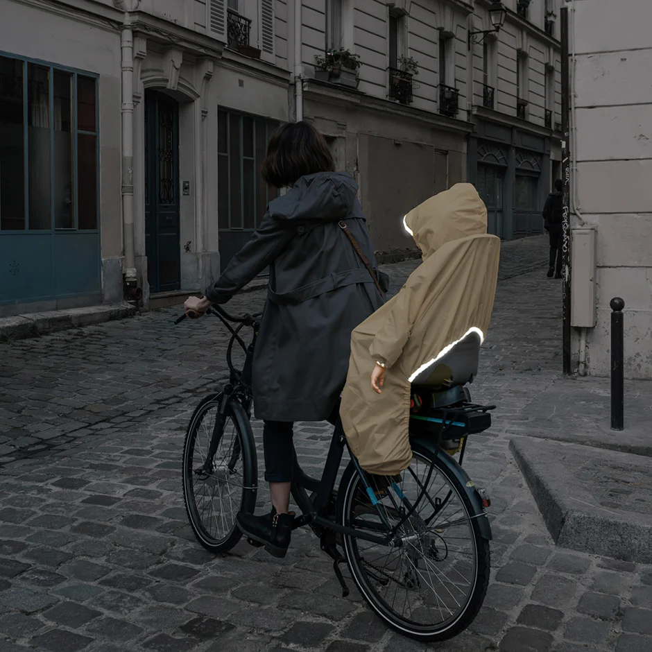 Coupe vent, imperméable et rétroréfléchissant, L’IMPERMEABLE DE RAINETTE s’adapte à tous les sièges vélos.