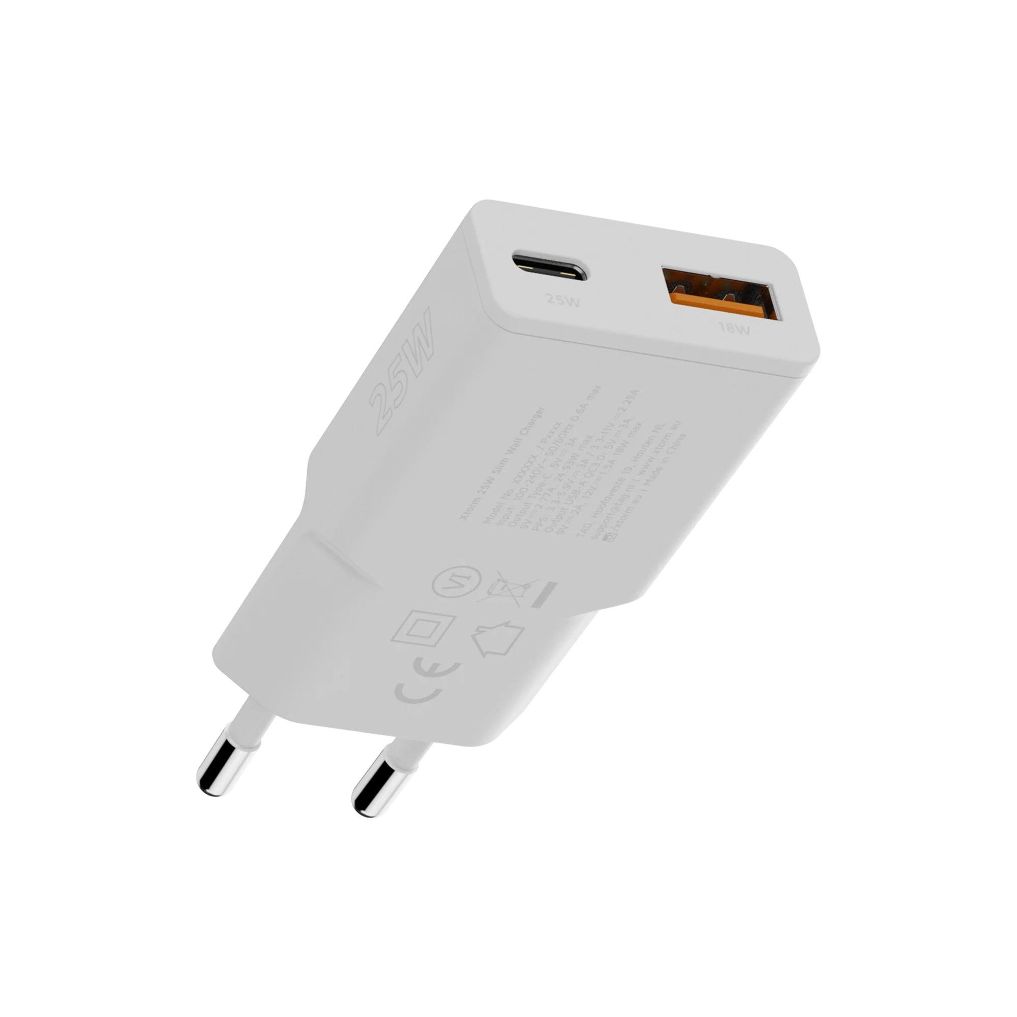 The Go2 SlimLine adapter has both a USB-A and a USB-C PD output. This makes this wall charger suitable for various small devices. Use the USB-A QC 3.0 port to charge devices with Xtorm 18W FastCharge. The USB-C PD port re-energizes your devices with Xtorm 25W SuperCharge. When using both outputs simultaneously, the total combined output is just 15W.