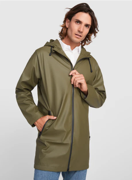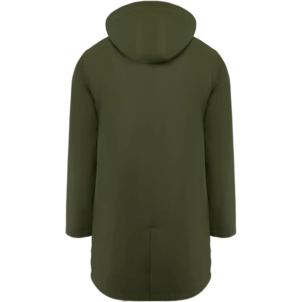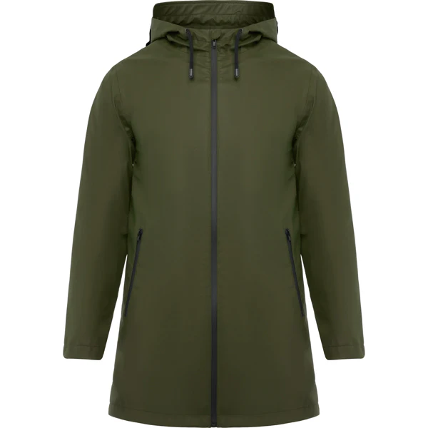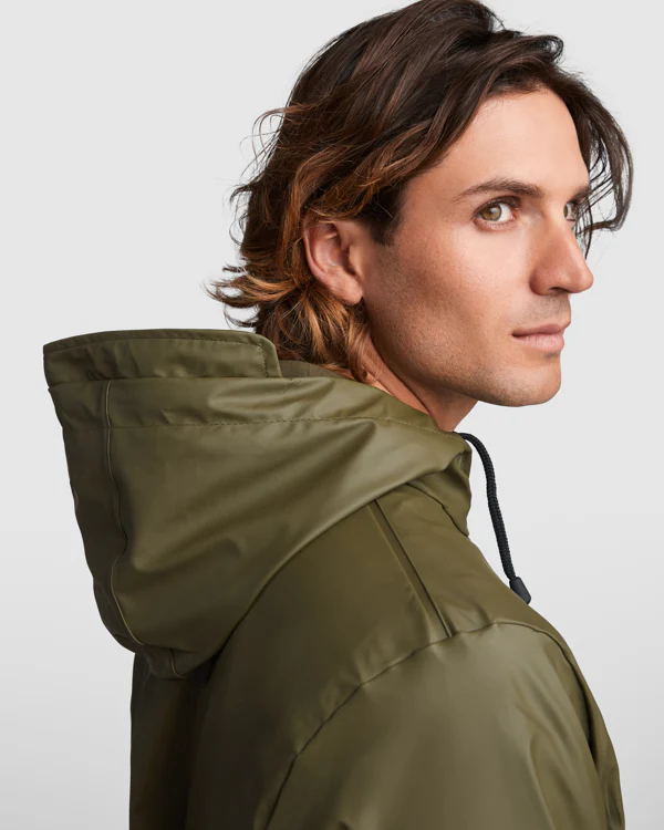 Veste imperméable. · Capuche fixe avec visière. · Fermetures éclair et coutures thermosoudées. · Détails contrastés en noir. · Deux poches latérales zippées. · Ourlet arrière avec ouverture.