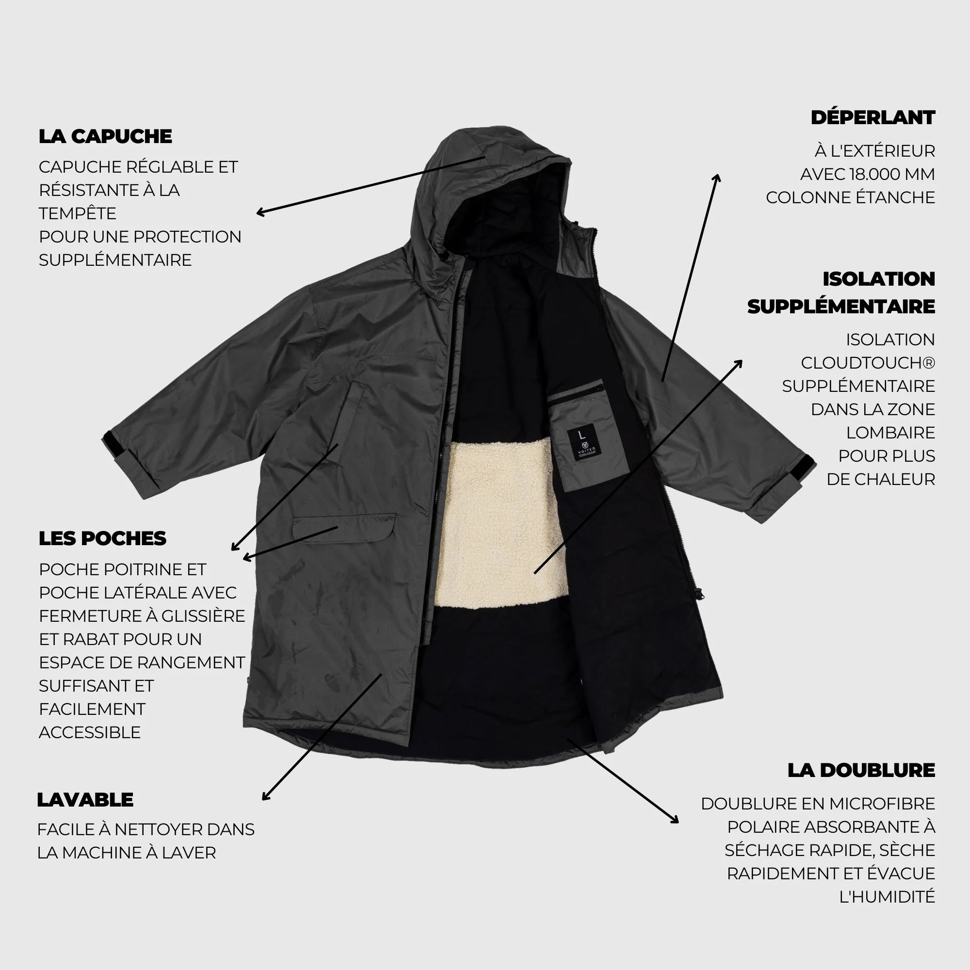 Le corps et les bras sont surdimensionnés pour vous permettre de vous changer facilement à l’intérieur ou de porter le manteau par-dessus votre combinaison de plongée comme abri personnel supplémentaire. Si vous préférez que le manteau soit plus ajusté, nous vous recommandons de prendre une taille en dessous.
