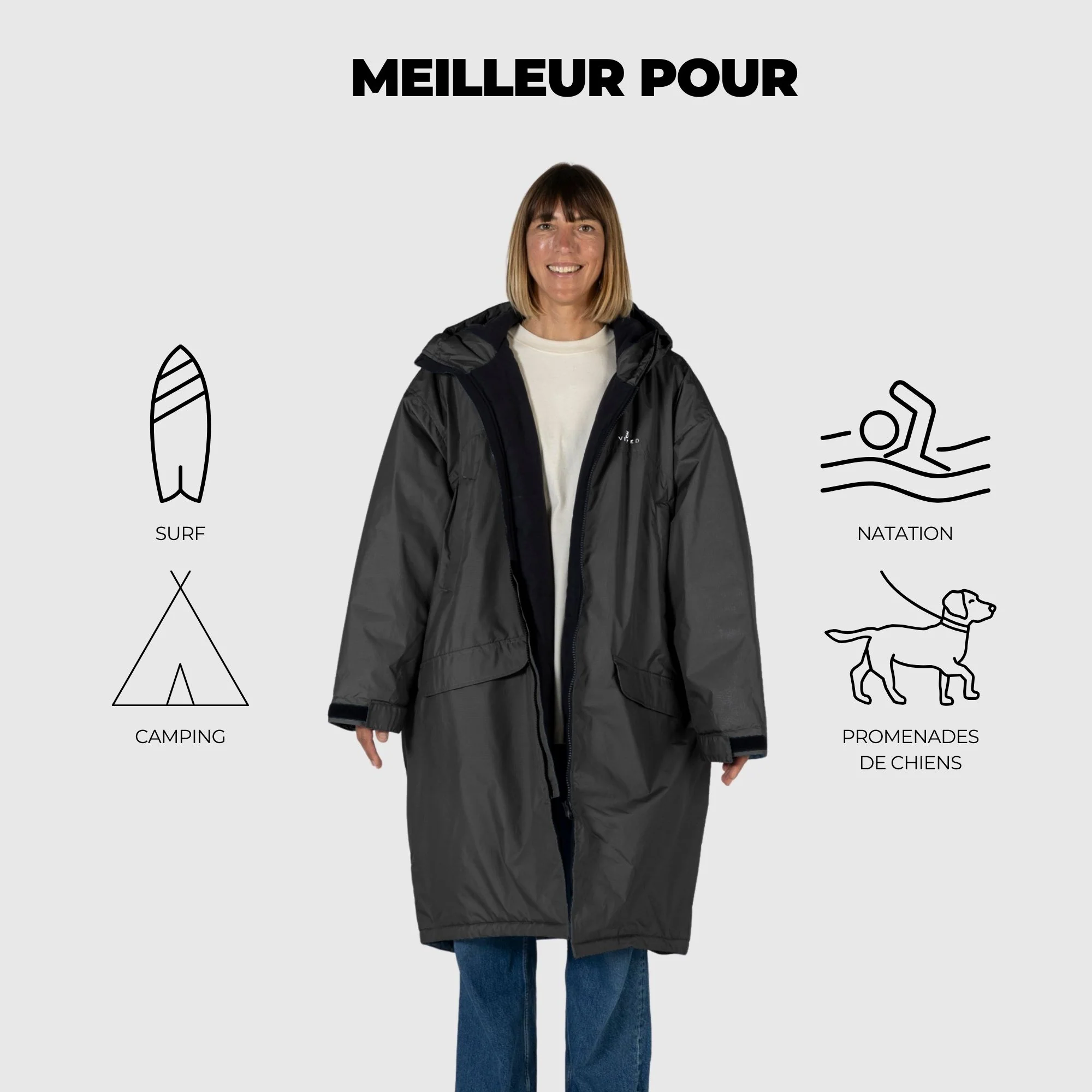 Reste au chaud, au sec et prêt pour chaque aventure, que tu te changes après une session de surf, que tu te rechauffes après une baignade en eau froide ou que tu ajoutes une couche supplémentaire sur tes vêtements.