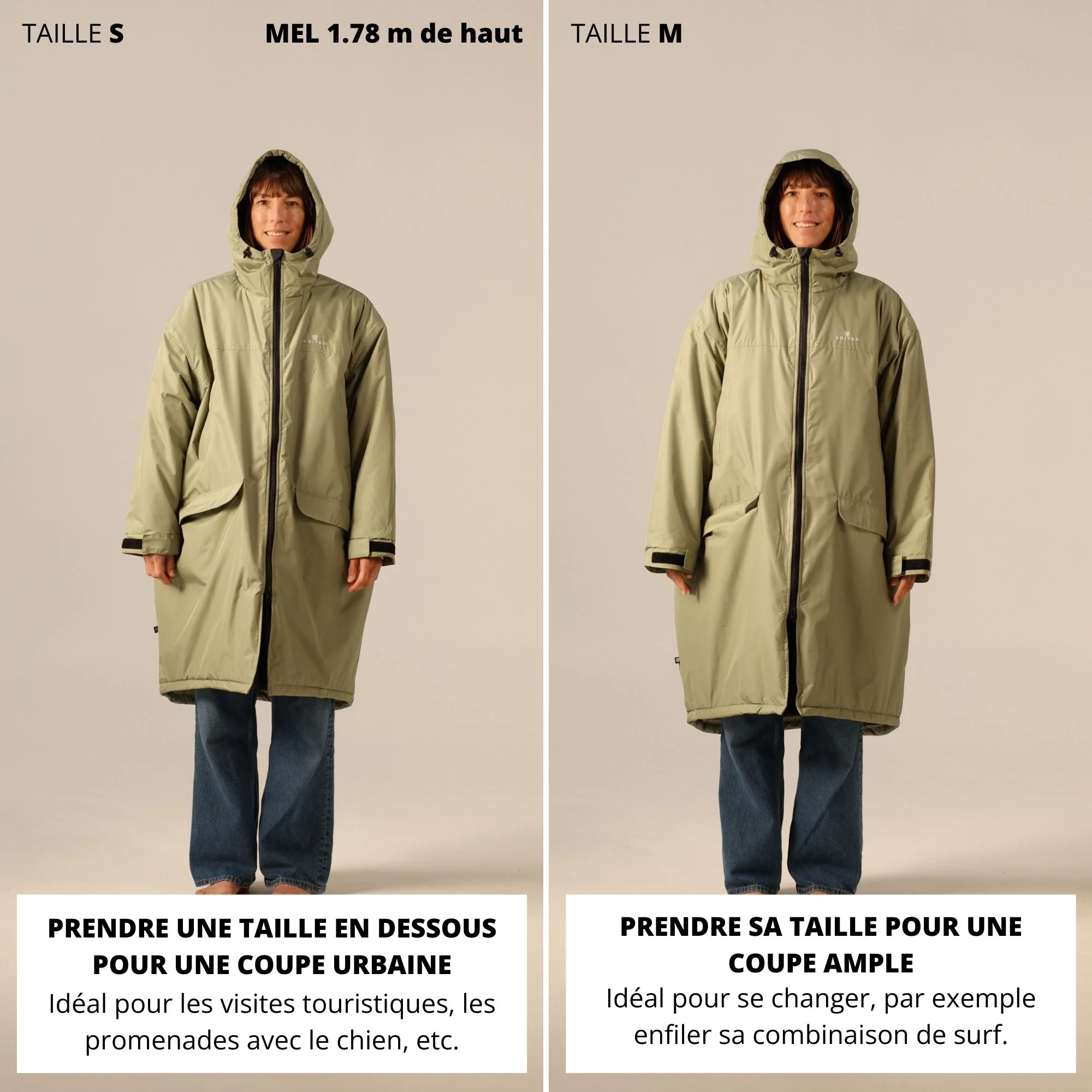 Le corps et les bras sont surdimensionnés pour vous permettre de vous changer facilement à l’intérieur ou de porter le manteau par-dessus votre combinaison de plongée comme abri personnel supplémentaire. Si vous préférez que le manteau soit plus ajusté, nous vous recommandons de prendre une taille en dessous.