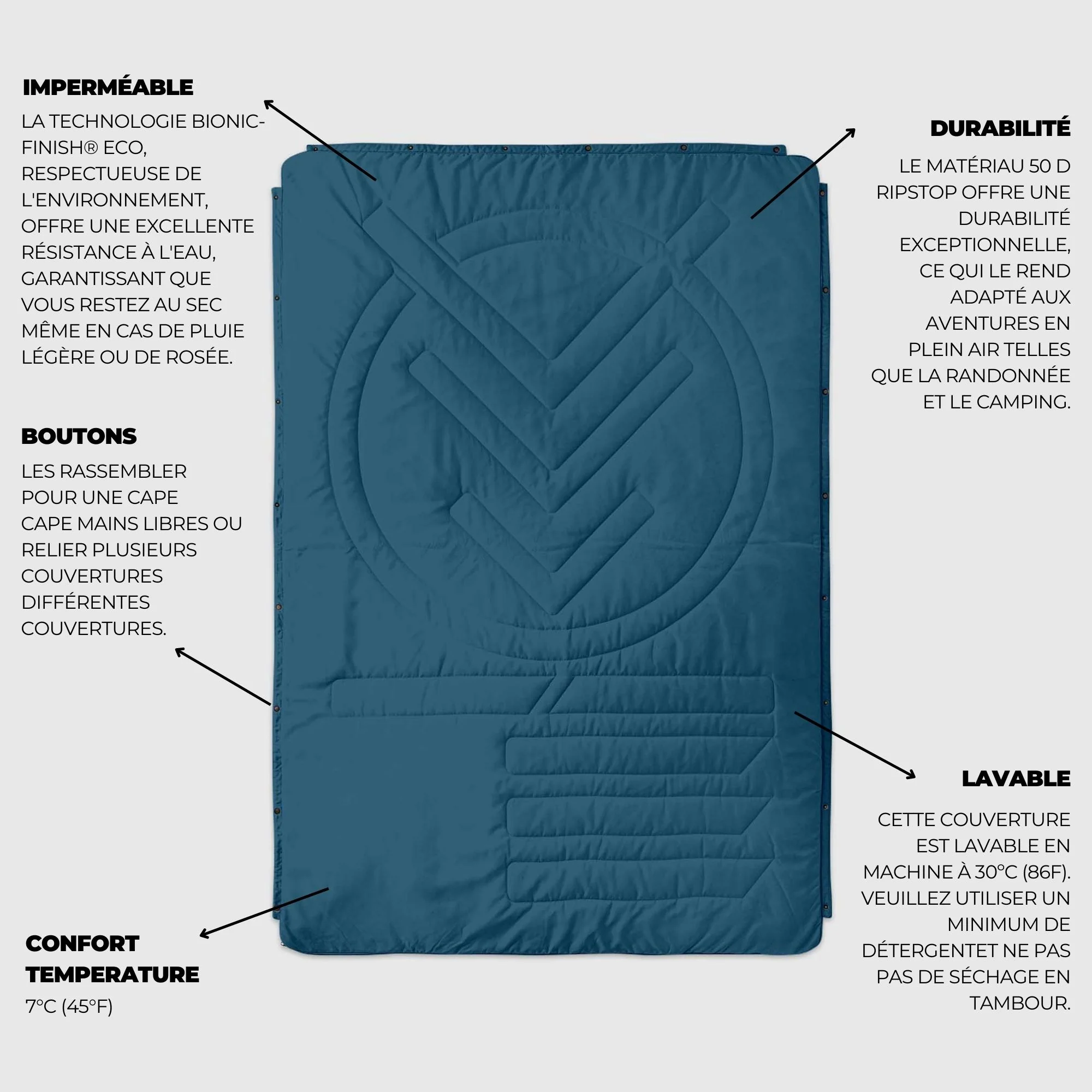Combinée avec notre tissu Ripstop REPREVE® recyclé avec traitement Bionic Finish®Eco Sans Fluorine, notre équipement d’extérieur offre une meilleure résistance à l’eau et aux taches. Enfin, nous ajoutons une couche de CloudTouch® brossé ultra-doux pour plus de chaleur, et ainsi obtenir des couvertures chaudes VOITED avec un confort amélioré, un toucher noble et une chaleur semblable à celle du duvet tout en permettant un lavage facile en machine.