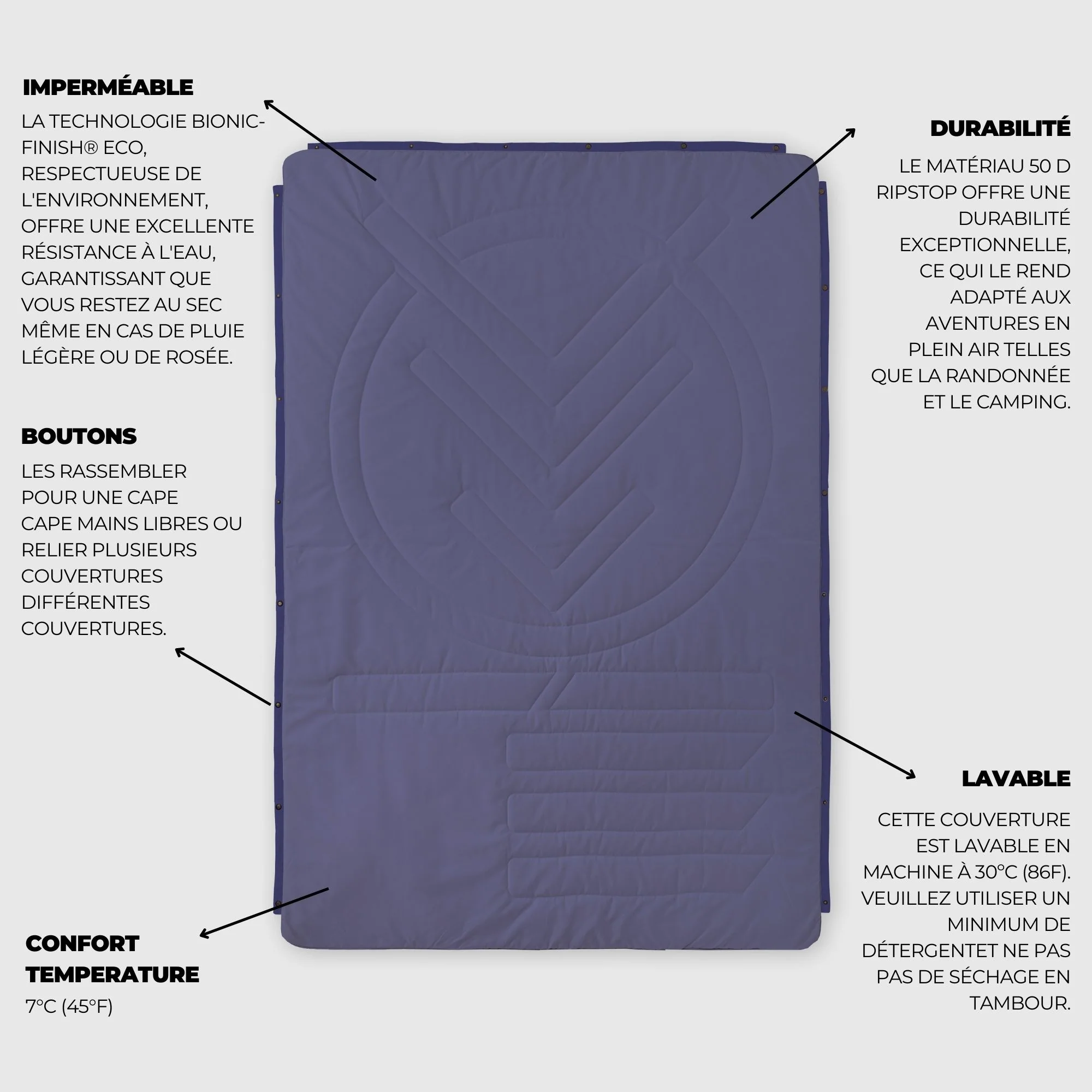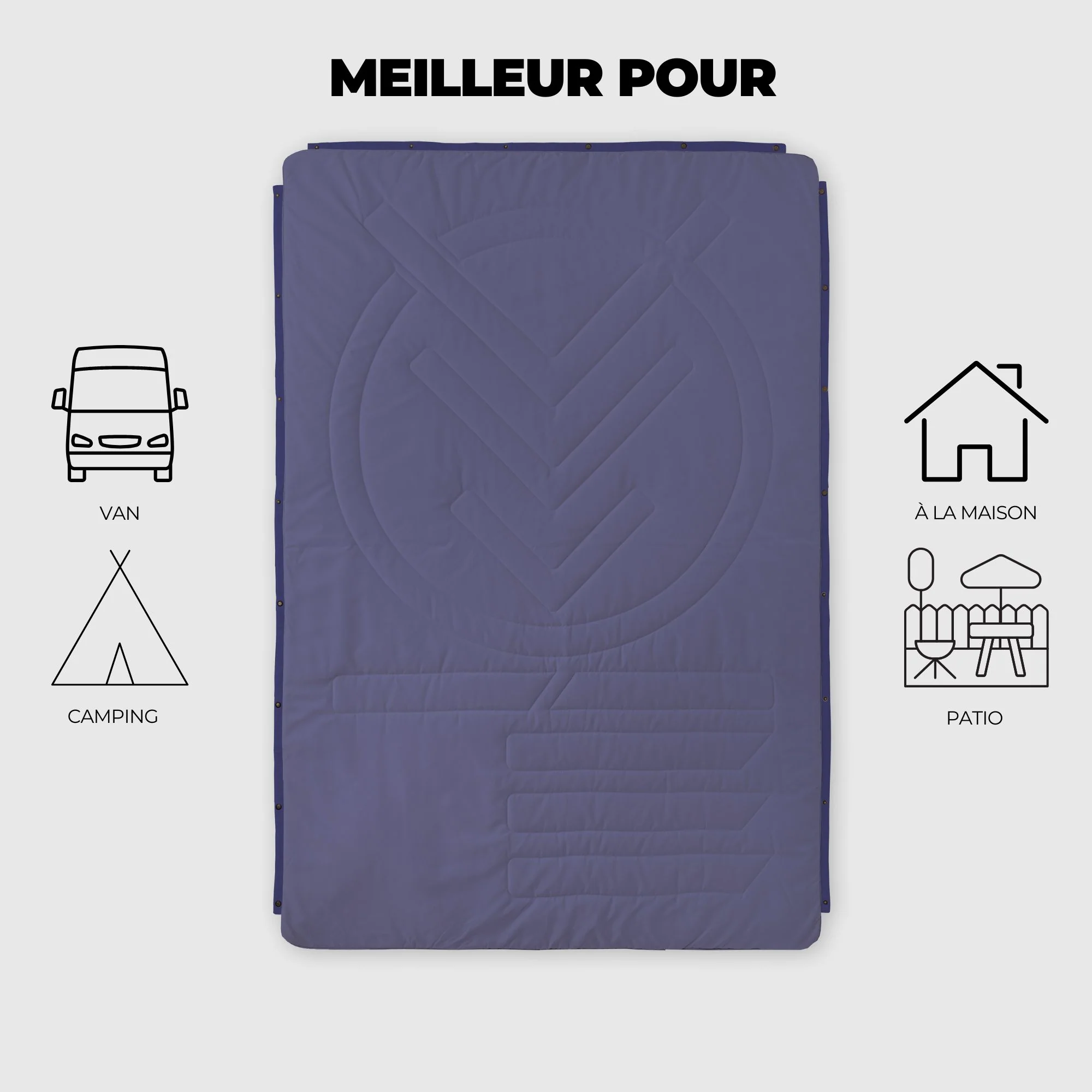 Une couverture chaude 4 en 1 matelassée et résistante à l’eau à utiliser à l’intérieur et à l’extérieur, pour les trips en van, le camping, les voyages et même à la maison. Ripstop recyclé d’un côté et polaire CloudTouch® brossée de l’autre. Durable. Résistante aux taches. Lavable en machine.