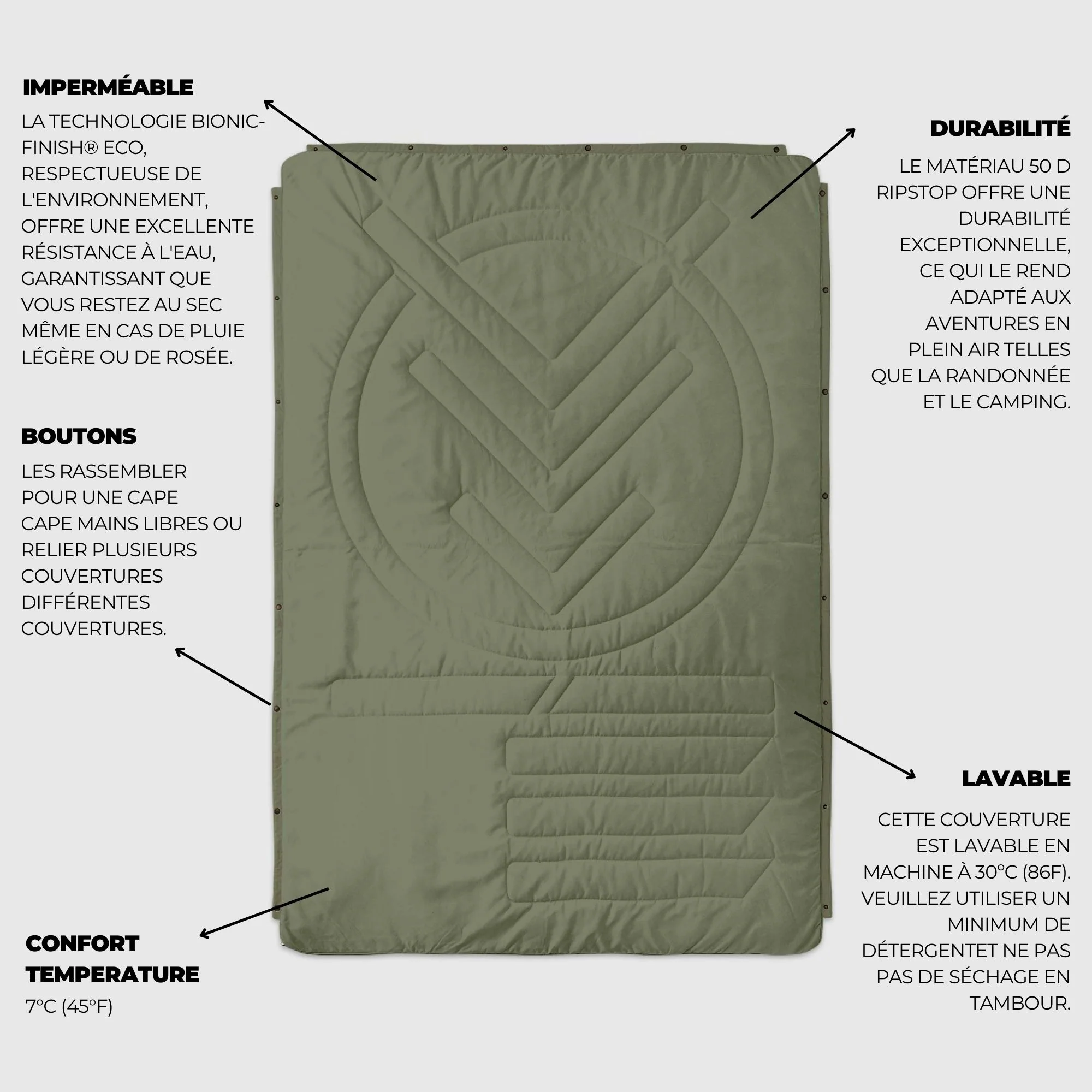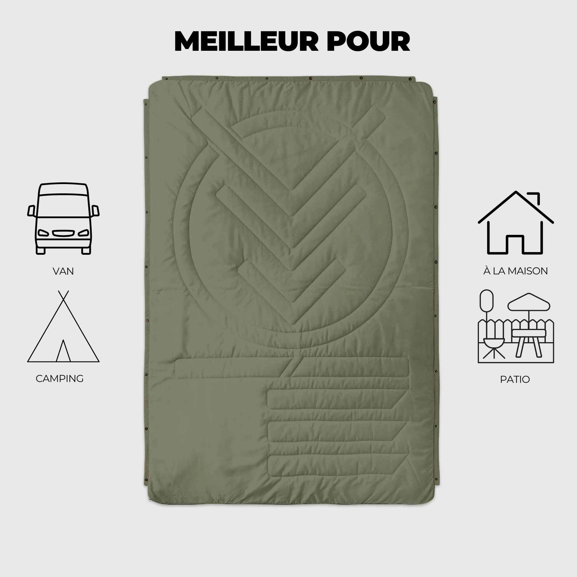Une couverture chaude 4 en 1 matelassée et résistante à l’eau à utiliser à l’intérieur et à l’extérieur, pour les trips en van, le camping, les voyages et même à la maison. Ripstop recyclé d’un côté et polaire CloudTouch® brossée de l’autre. Durable. Résistante aux taches. Lavable en machine.