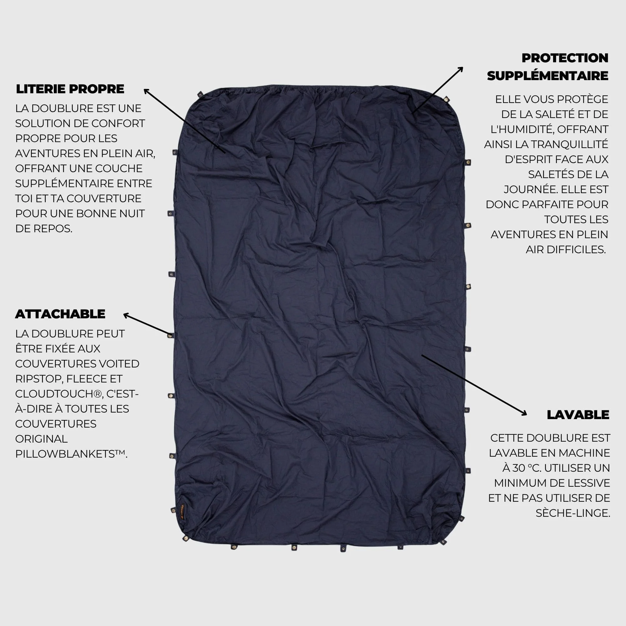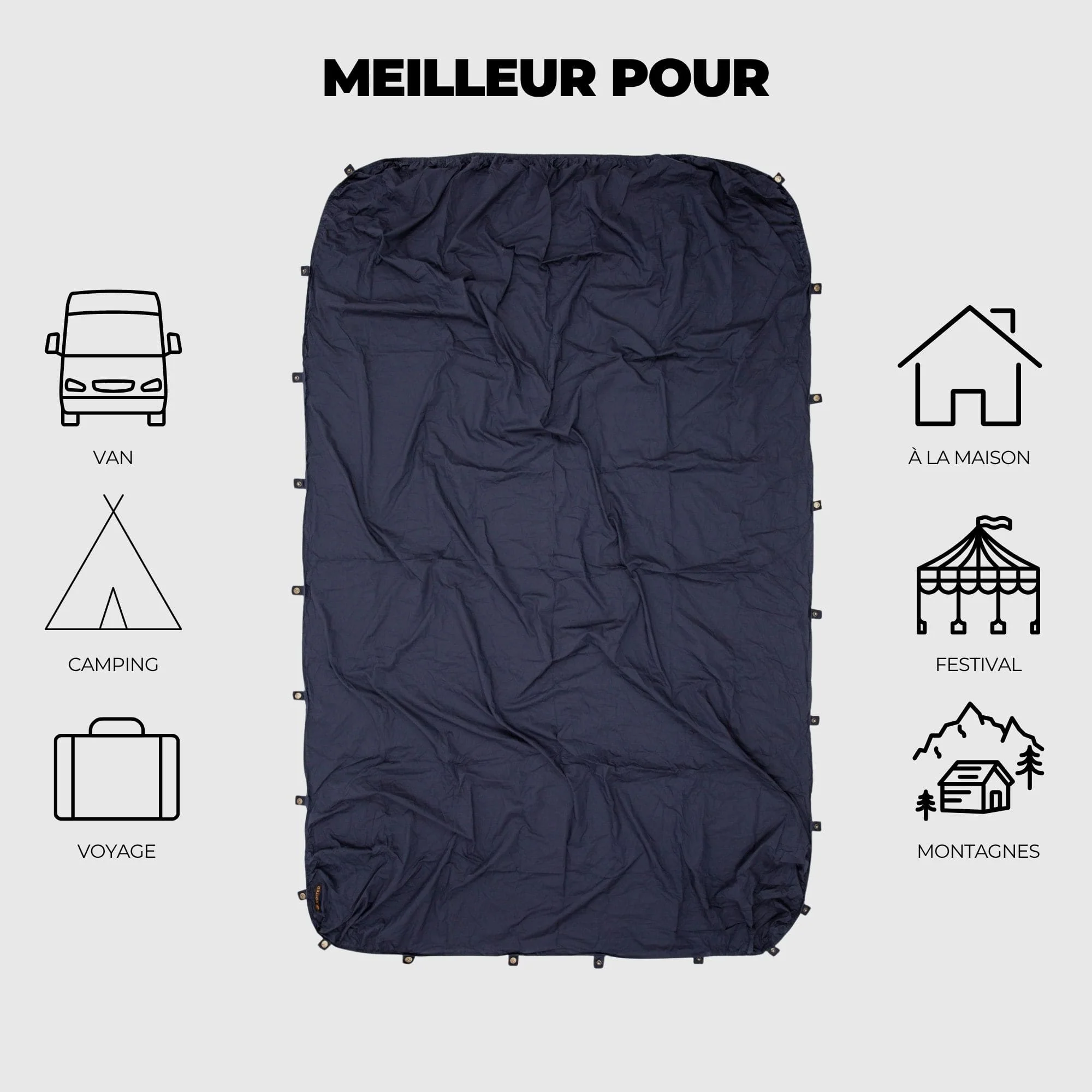 Que vous ayez utilisé votre couverture pour un pique-nique dans l’herbe, à la plage, à la montagne ou pour vous abriter de la pluie, il suffit d’enclencher le Cotton Sheet sur votre couverture et vous êtes couvert pour une bonne nuit de repos.Il se fixe à l’intérieur des couvertures 4 en 1.