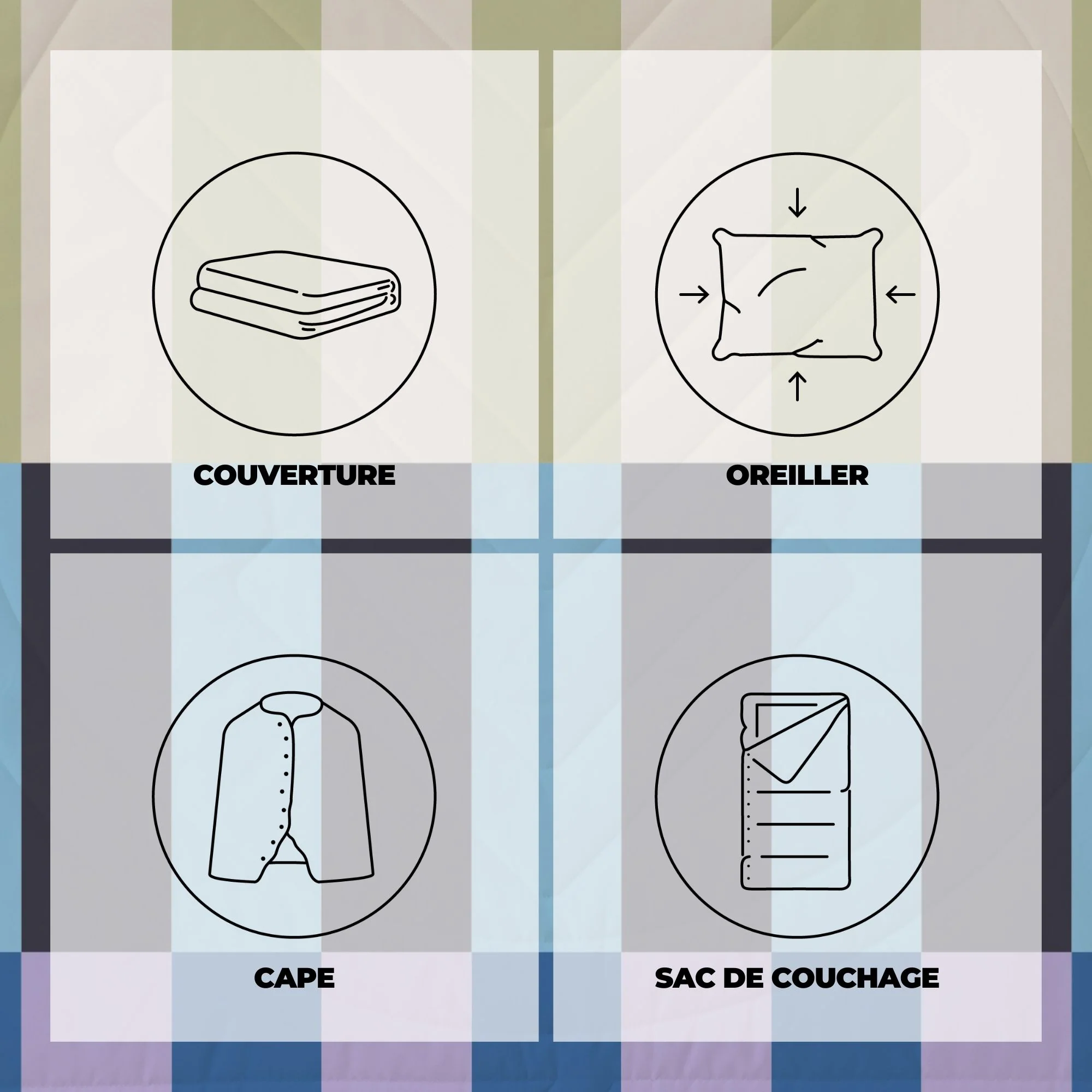 • Conception polyvalente : Avec sa fonctionnalité 4-en-1, la couverture CloudTouch® se transforme en oreiller, en couverture, en sac de couchage et en cape imperméable, offrant une adaptabilité pour diverses activités et aventures de plein air.