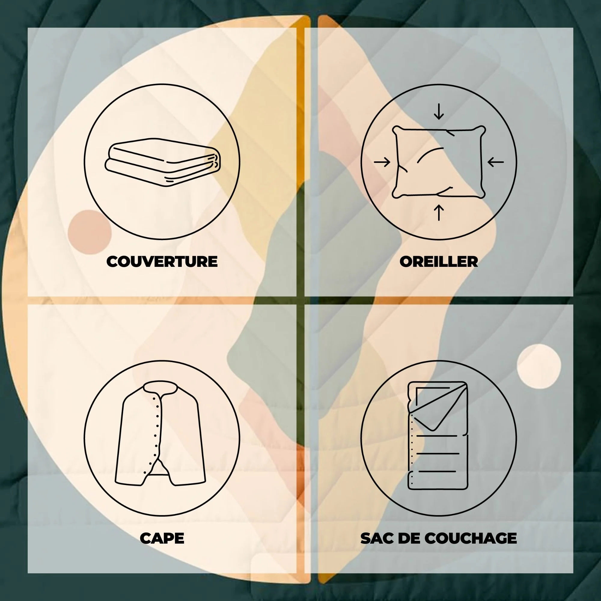 • Conception polyvalente : Avec sa fonctionnalité 4-en-1, la couverture CloudTouch® se transforme en oreiller, en couverture, en sac de couchage et en cape imperméable, offrant une adaptabilité pour diverses activités et aventures de plein air.