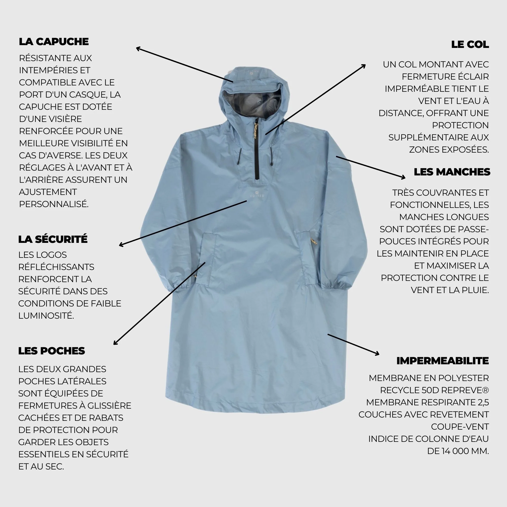 Le poncho de pluie 2.0 est lavable en machine à 30 °C. Utiliser une quantité minimale de lessive et ne pas sécher au sèche-linge.