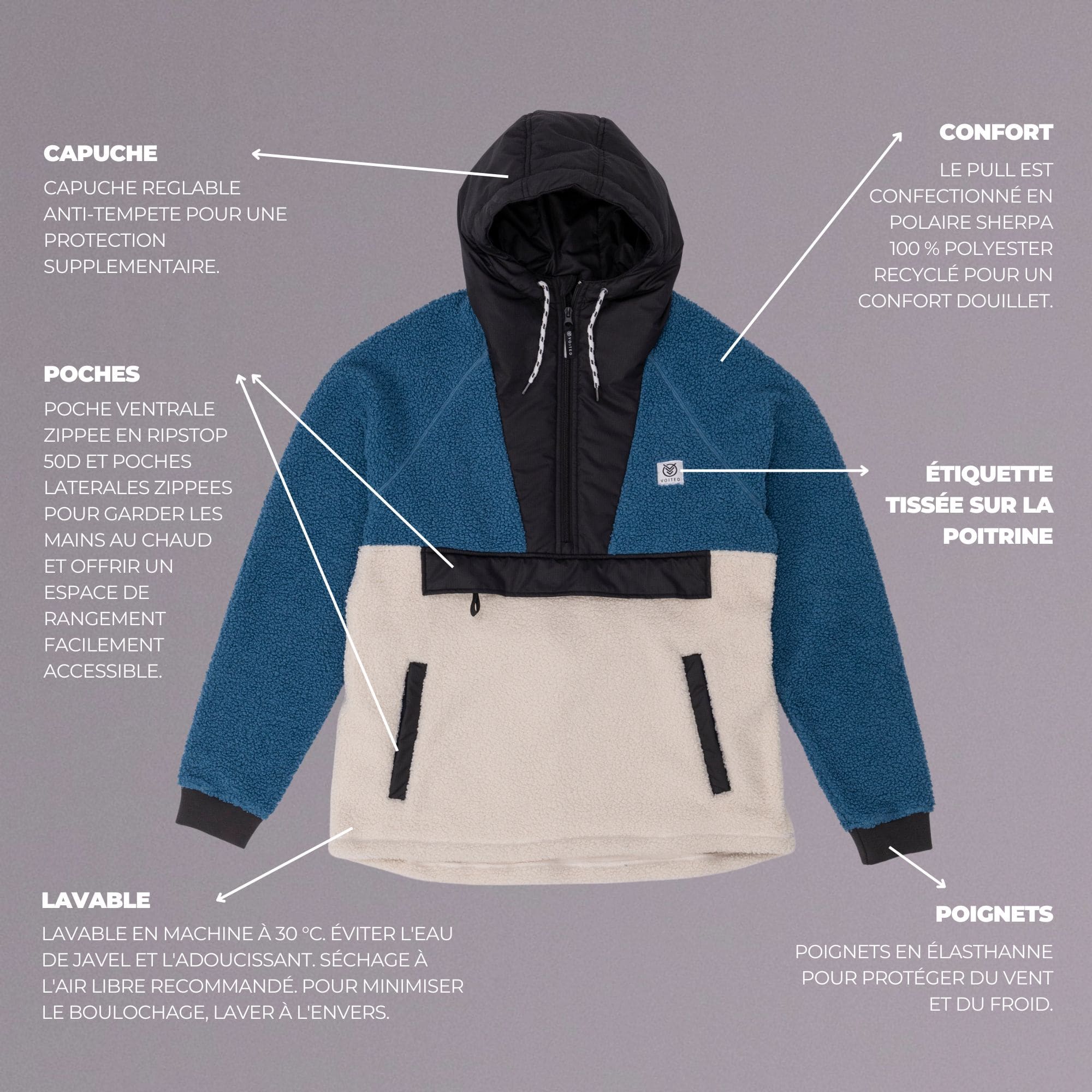 Entièrement fabriqué à partir de fil de polyester 100 % recyclé, ce sweat à capuche en polaire sherpa incarne la chaleur durable de VOITED. Les détails en Ripstop 50D améliorent la durabilité et la fonctionnalité sans ajouter de volume, tandis que le corps en polaire moelleuse te garde au chaud et à l’aise dans des conditions variables.