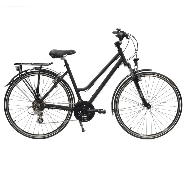 Équipé haut de gamme et pratique. Tout en alu et inox pour plus de robustesse et de longévité. Suspension avant et développement long des roues 28″ apportent un vrai confort avec la souplesse des 21 vitesses Shimano.